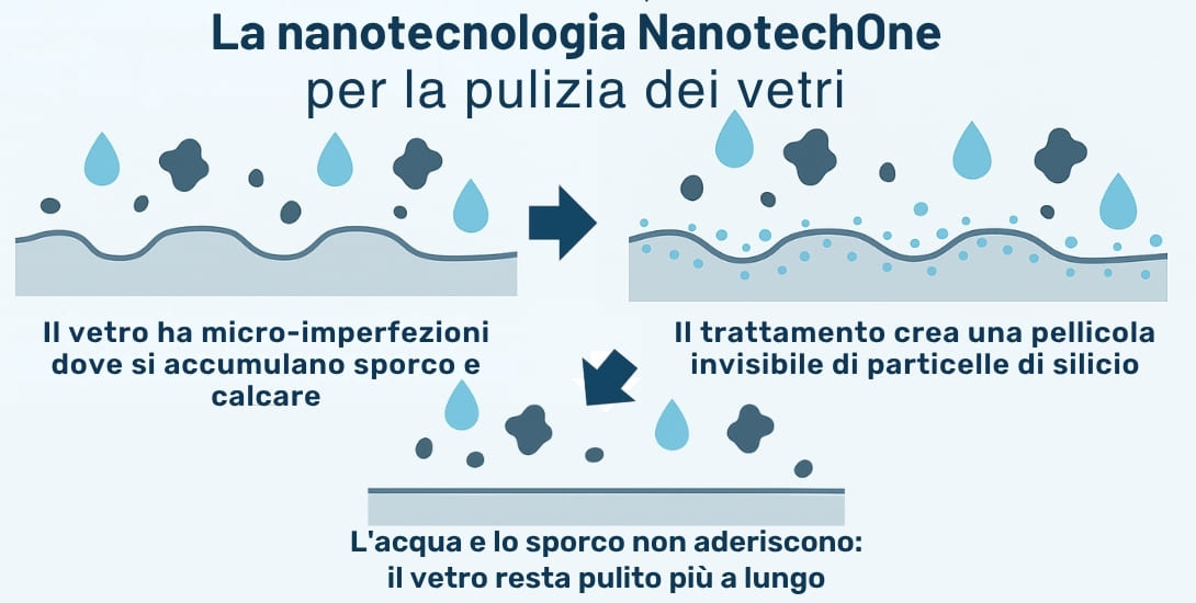 Il risultato è una barriera invisibile e duratura che non si limita a depositarsi sopra, ma diventa parte integrante del vetro o della ceramica, modificandone la struttura. Non è un coating o olio siliconico quindi non si stacca nè ingiallisce nel tempo