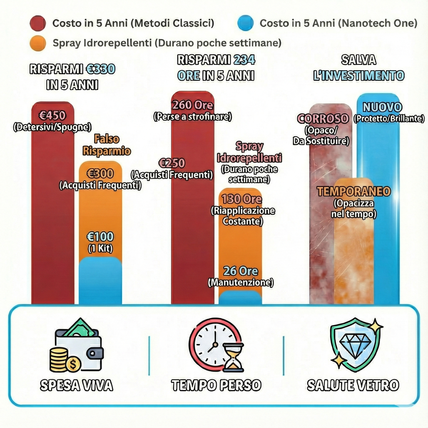 Con i metodi tradizionali butti via ~€100/anno in anticalcare, detergenti e panni. Con un solo trattamento il vetro è protetto e anche ripristinato da usura, è brillante e idrorepellente fino a 5 anni: il risultato è ~€500 risparmiati nel tempo senza strofinare