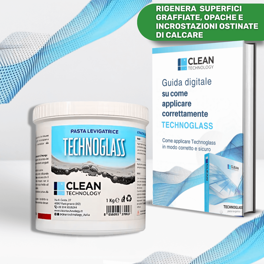 TechnoGlass è una pasta levigatrice per la rimozione di graffiature e macchie di varia origine e natura da vetri e altre superfici. È il prodotto ideale da utilizzare quando non è possibile rimuovere con acidi o prodotti anticalcare un deposito di calcare o altre sostanze, anche molto vecchie, da box doccia o supporti similari.